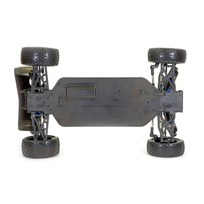 Un nouveau plateau supérieur en aluminium renforce et renforce le châssis, tandis que des renforts de suspension avant et arrière en aluminium moulé anodisé améliorent la durabilité. Des ressorts de longueur améliorée et des amortisseurs à bain d'huile à grand débattement et à grand alésage offrent un meilleur amortissement, tandis que la suspension à double triangulation assure une tenue de route optimale. La transmission utilise des différentiels avant et arrière avec pignons coniques, couronne et pignon de sortie métalliques pour gérer la vitesse et le couple du moteur brushless alimenté par lipo.