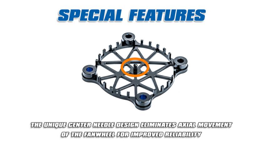 La conception unique de l'aiguille centrale élimine le mouvement axial de la roue du ventilateur pour une fiabilité accrue.