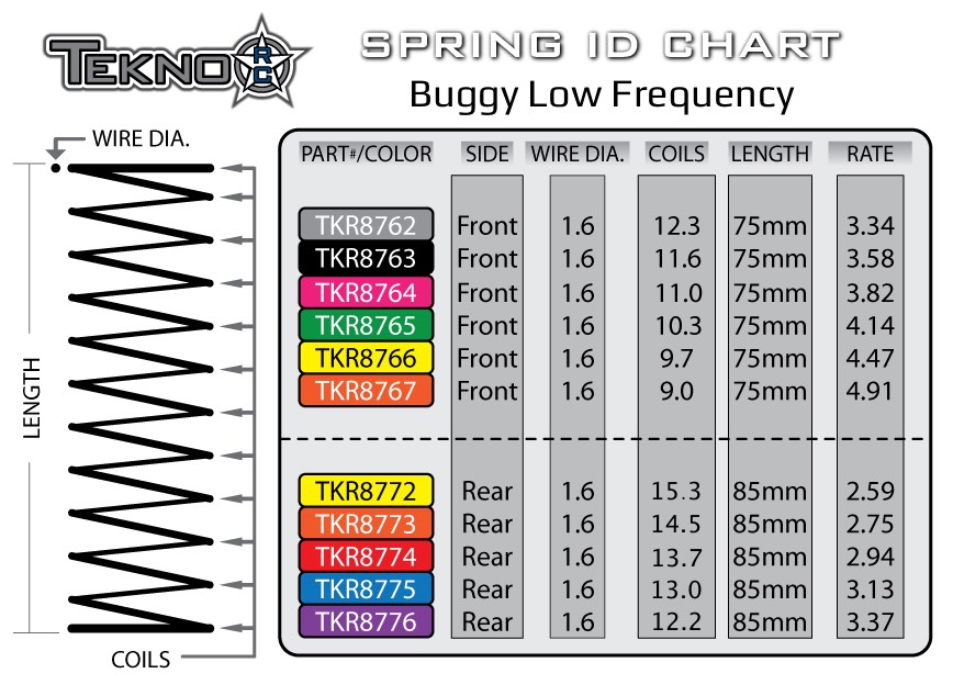 La nouvelle Fréquence Basse (LF), améliore la traction en réduisant l'oscillation du châssis sur des surfaces de pistes rugueuses et les grandes réceptions de saut. La stabilité globale du véhicule est améliorée, offrant une meilleure adhérence de l'avant, l'augmentation de la vitesse d'angle. Avec des bobines supplémentaires, ainsi qu'un diamètre de fil plus grand, les nouveaux ressorts LF disposent d'une finition en bronze avec un indicateur de couleur pour une identification facile. Les ressorts conviennent à toutes les variantes du NB48 et EB48 et ne sont pas conçus pour les véhicules SCT, Truggy ou EB48SL. Au moment de décider d'essayer nos nouveaux ressorts de LF, nous suggérons de commencer avec la même dureté que vous utilisez actuellement ou peut-être une dureté plus douce. Par rapport aux ressorts standard, nos ressorts LF fonctionnent mieux dans la plupart des conditions. Utilisez le tableau ci-dessous pour les recommandations piste / type de condition spécifique à cette force de ressort.