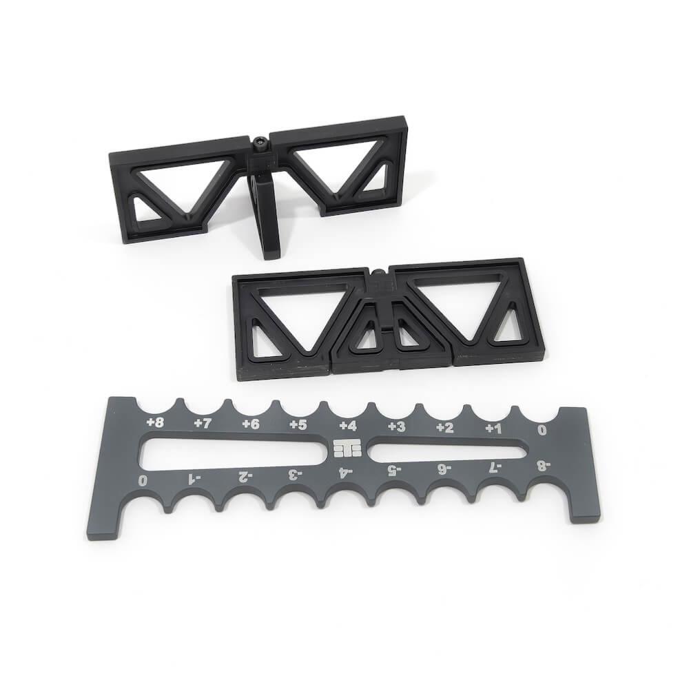 La jauge est usinée avec précision en aluminium, gravée au laser et anodisée dans notre couleur signature pour une durabilité et une lisibilité optimales. Les blocs de statisme articulés mesurent 40 mm de haut et sont fabriqués dans un composite robuste et léger, ce qui permet de gagner de la place dans votre sacoche et de protéger la surface de votre châssis en évitant les rayures.